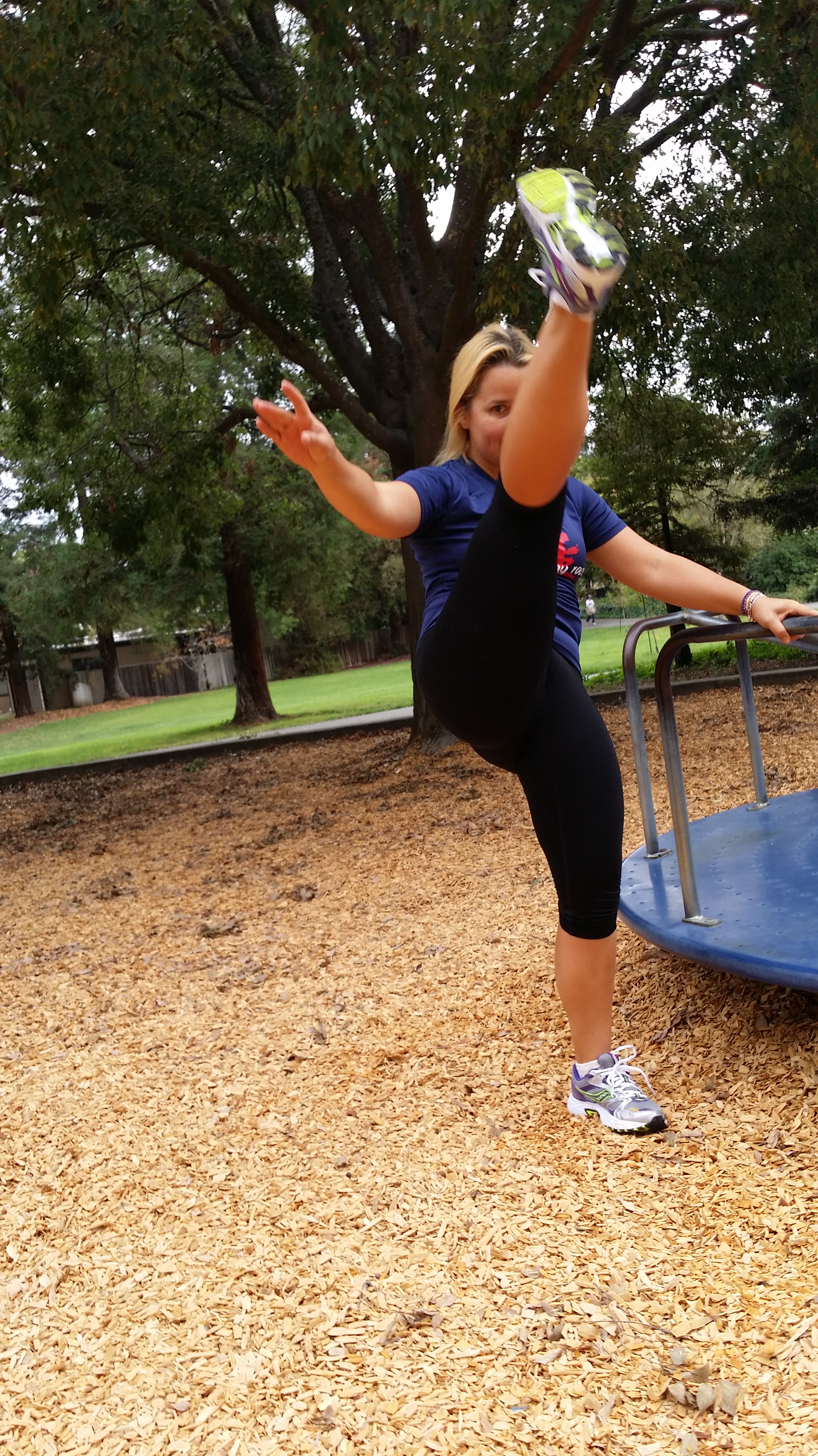 I start with my warm up, jogging to a playground that is about 1 mile (10-15 minutes) away from our house. Once I get to the park, I start playing game with my girls: an animal game (monkey bars), wheels on the bus game (squads on a carousel or a swing), a counting game( holding my legs up while hanging on a ladder). We also play “who can jump the fastest to the other side go the playground” (since I am bigger I have to jump on one leg), or “who is the fastest crab” (get in the squad position and try to walk without getting up), or some other silly game that my girls come up with every time.
