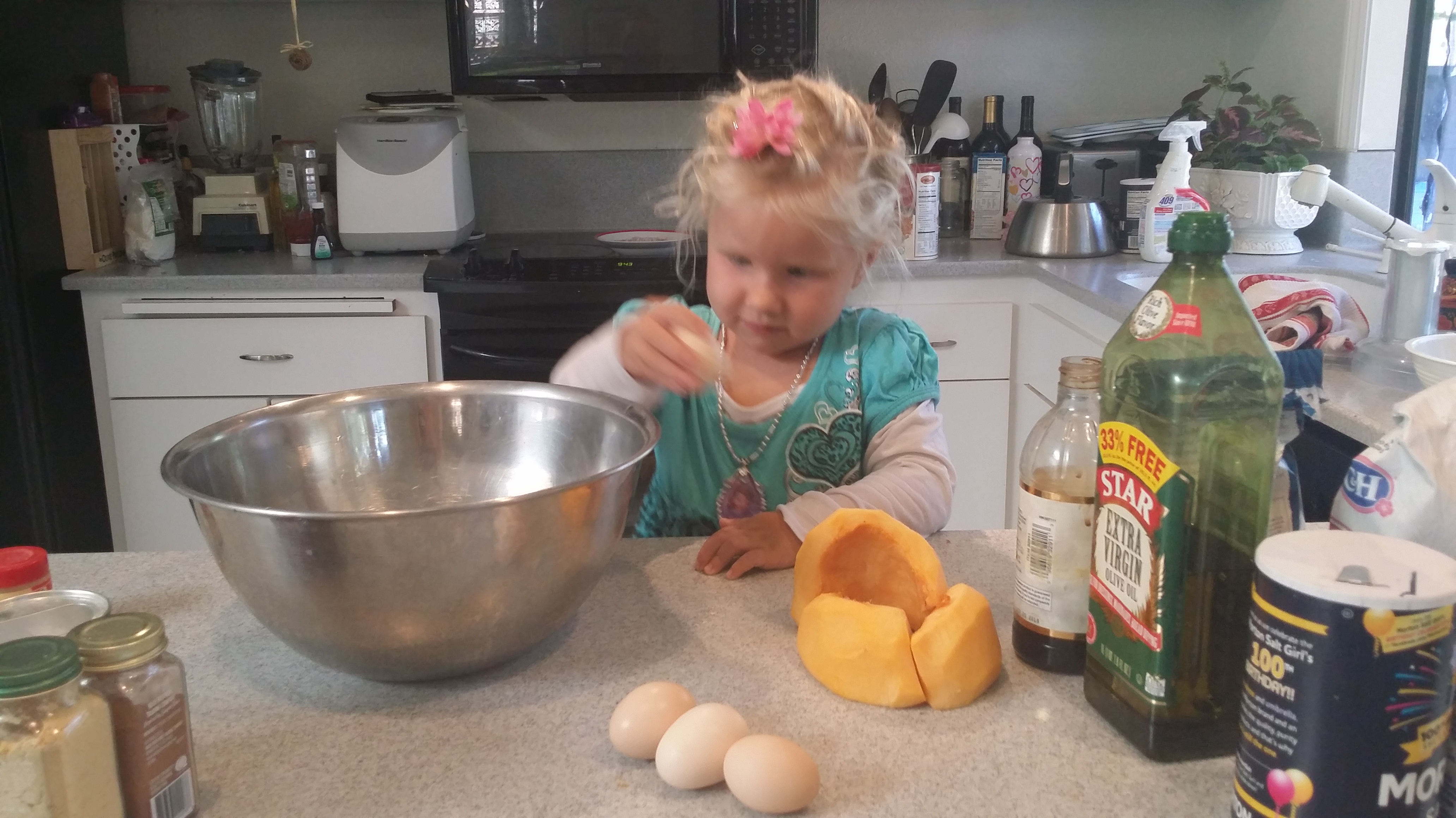 Then, give your child a large bowl. Let him/her crack the egg, then mix in the sugar, oil, and vanilla. Then have your child add the flour mixture to the sugar mixture and mix until just combined. Add the pumpkin and mix everything together. (As you see, I let my three year old do everything herself. I am not saying that I gave her everything and left, no, I supervised her every step, but I let her do it from the beginning to the end.)