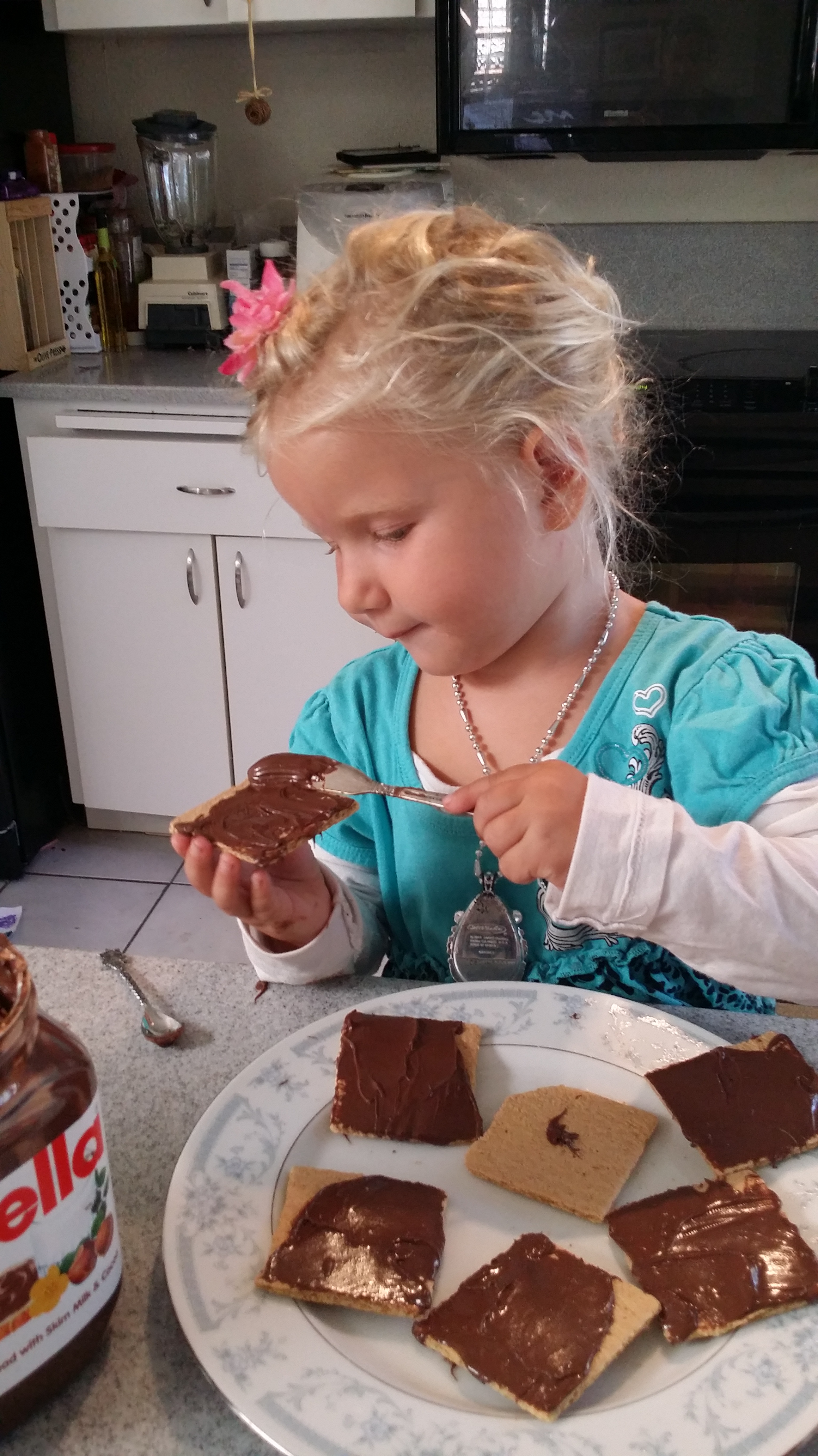 First, have your preschooler spread Nutella on Gram Crackers