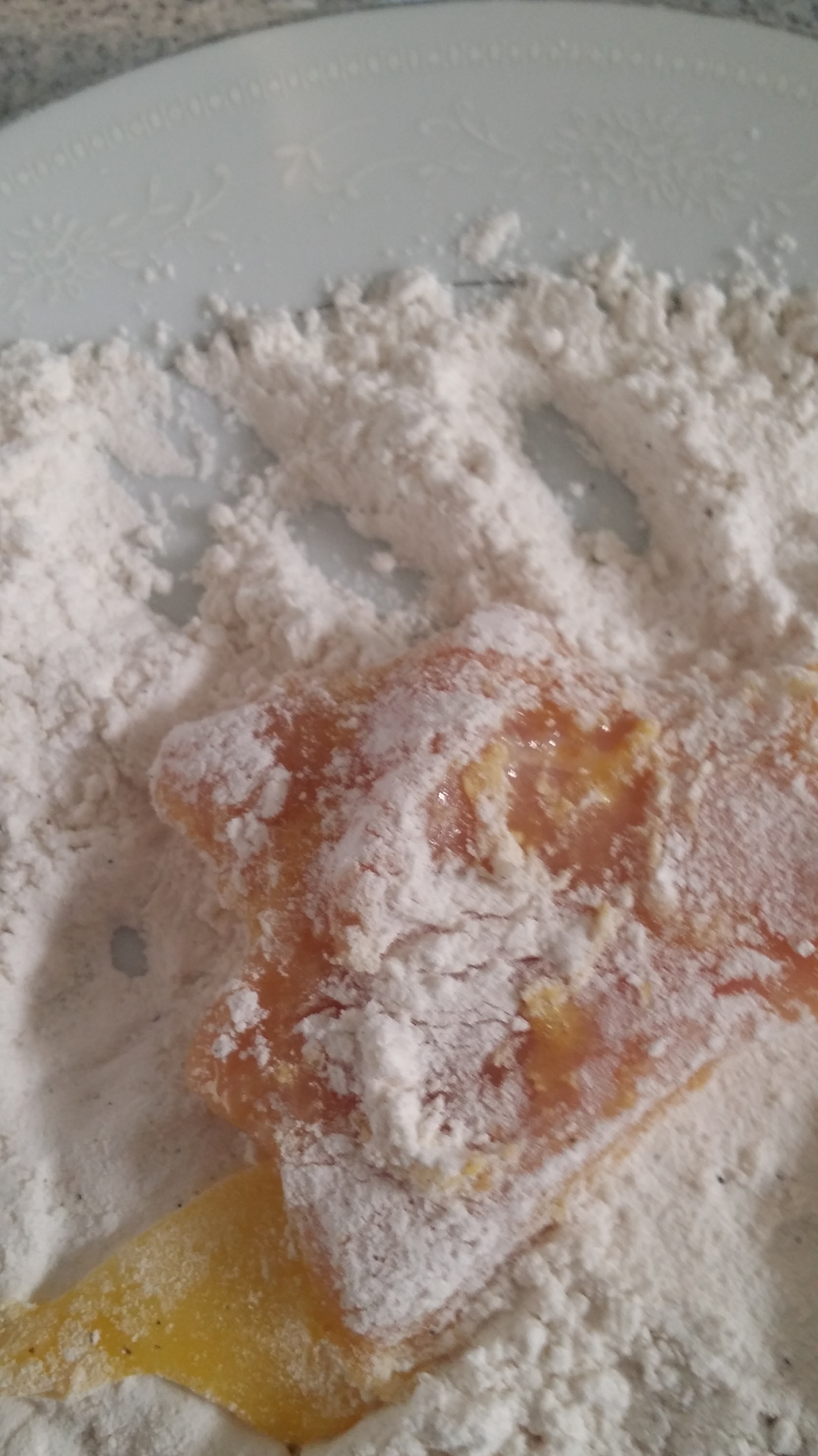 Place the egged chicken on the flour plate and pad both sides in the flour mixture.