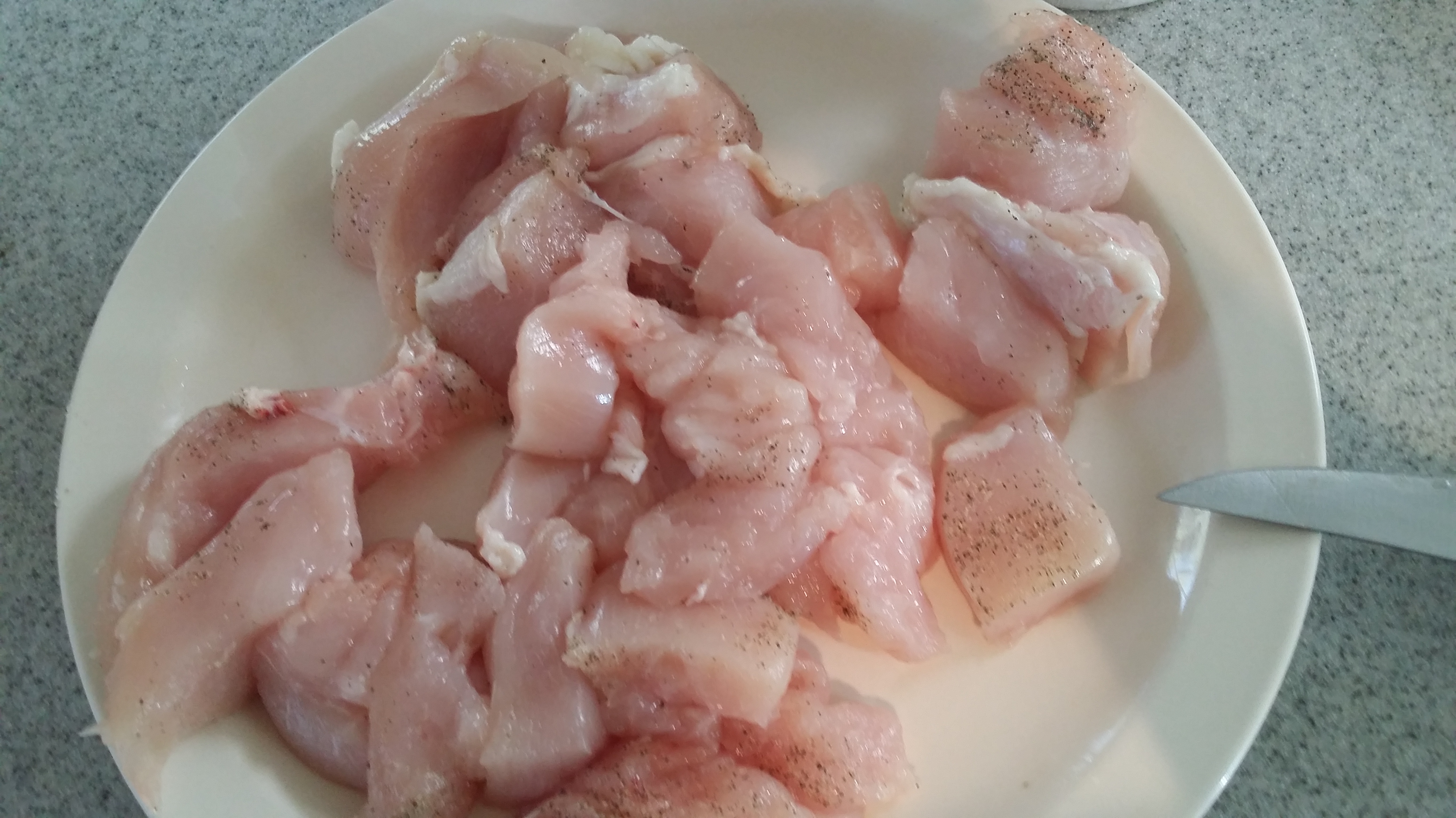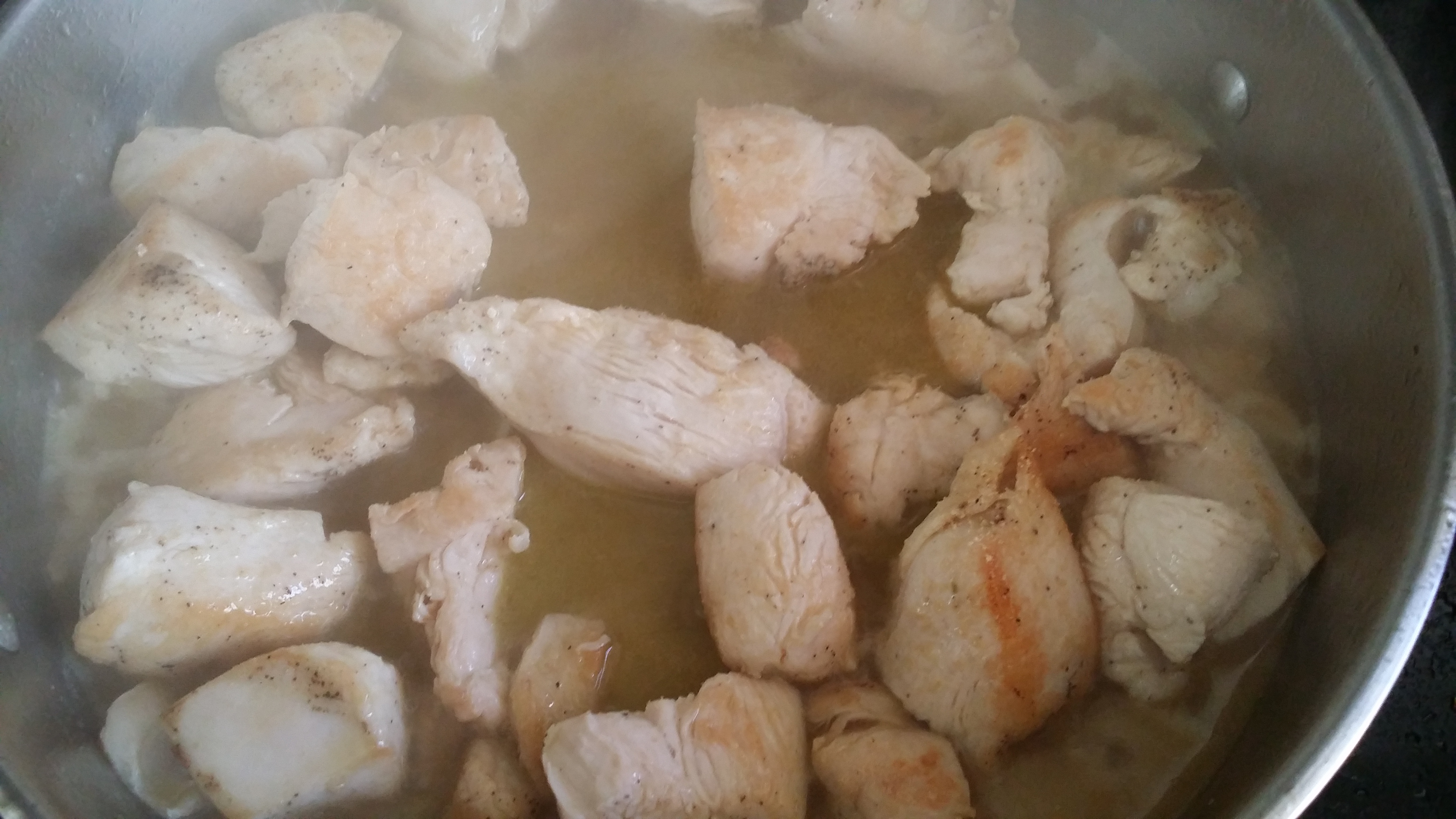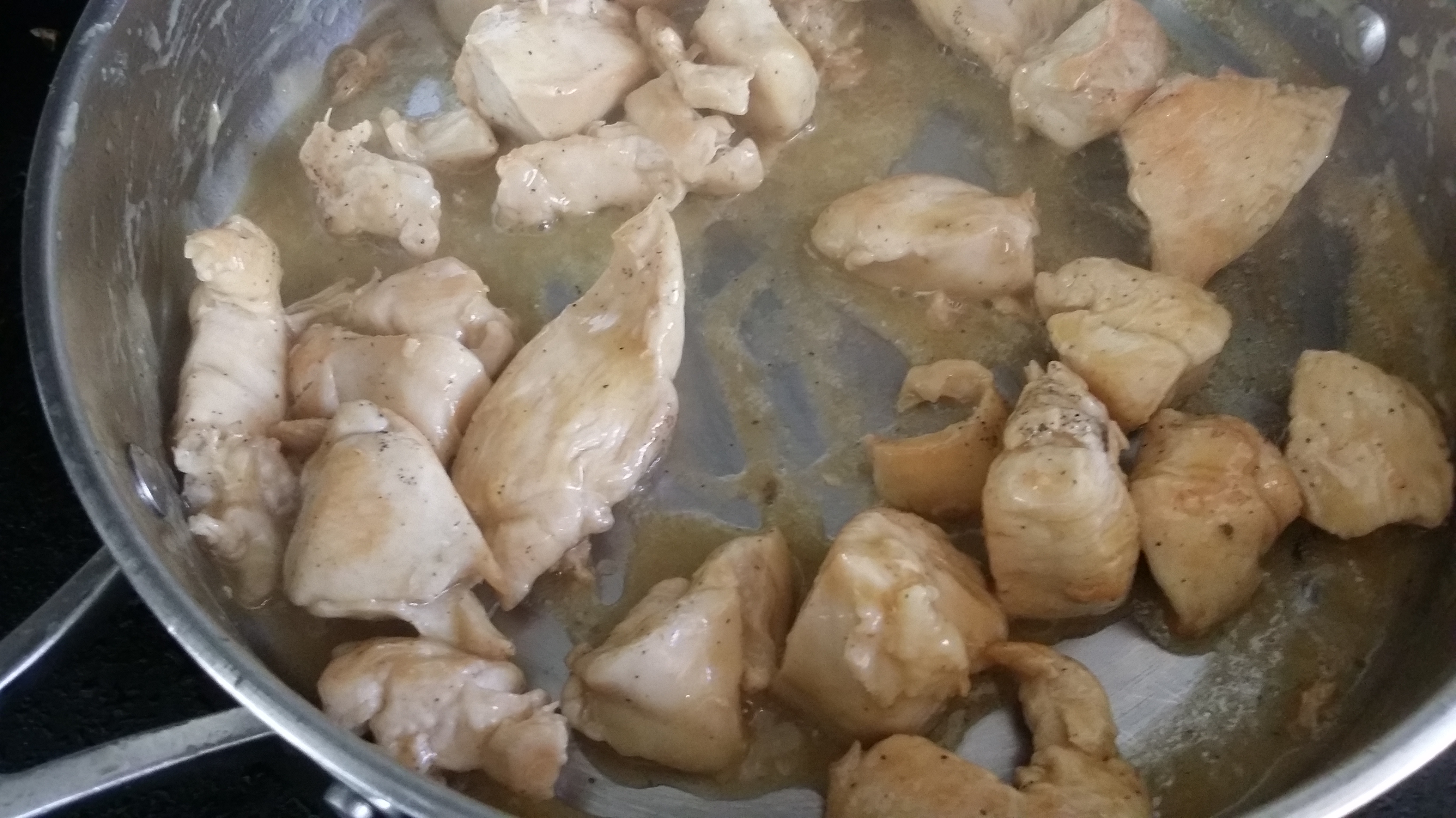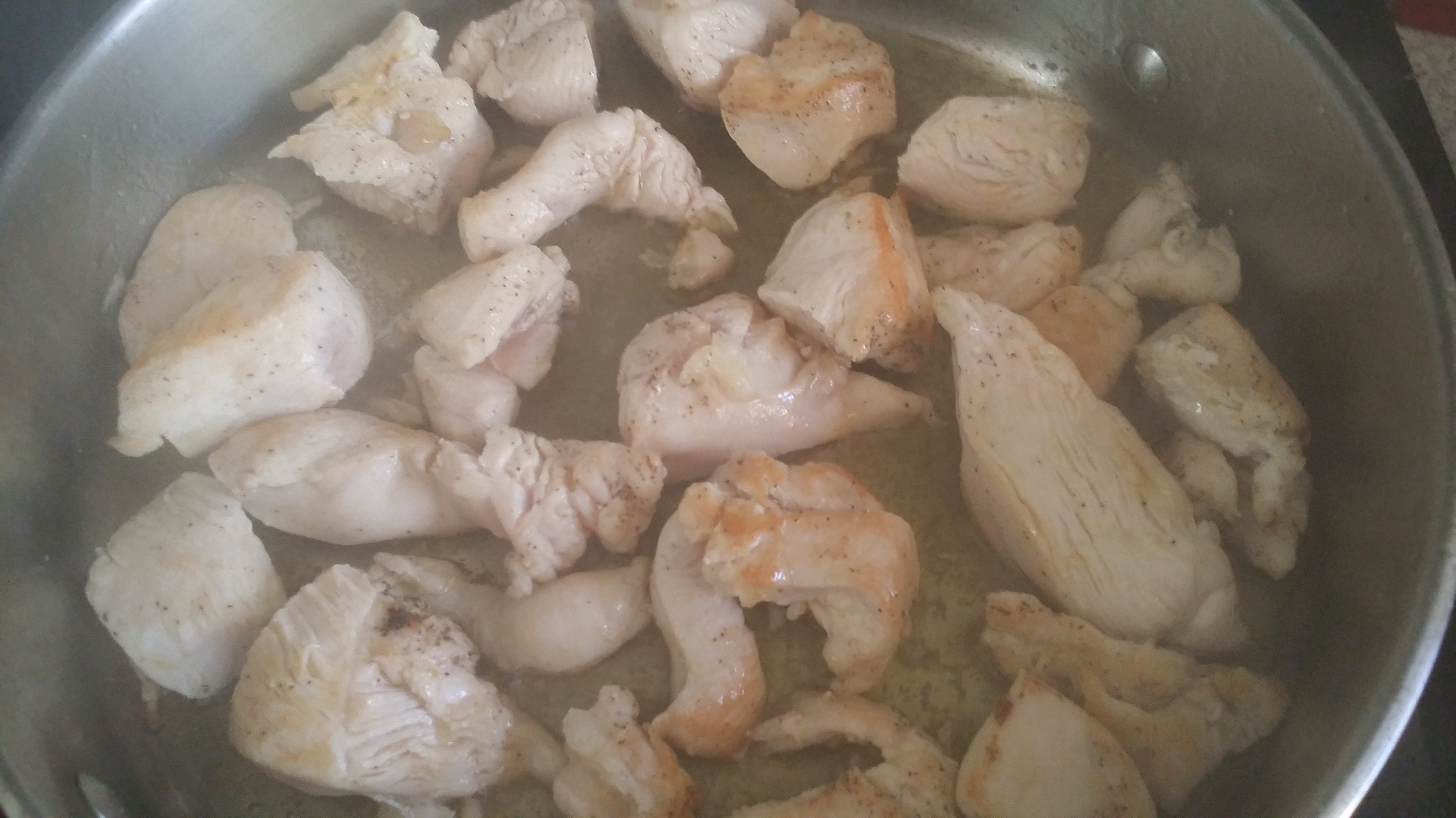Meanwhile, in sauce pan saute minced garlic with olive oil on medium heat. Cut your chicken into cubes.