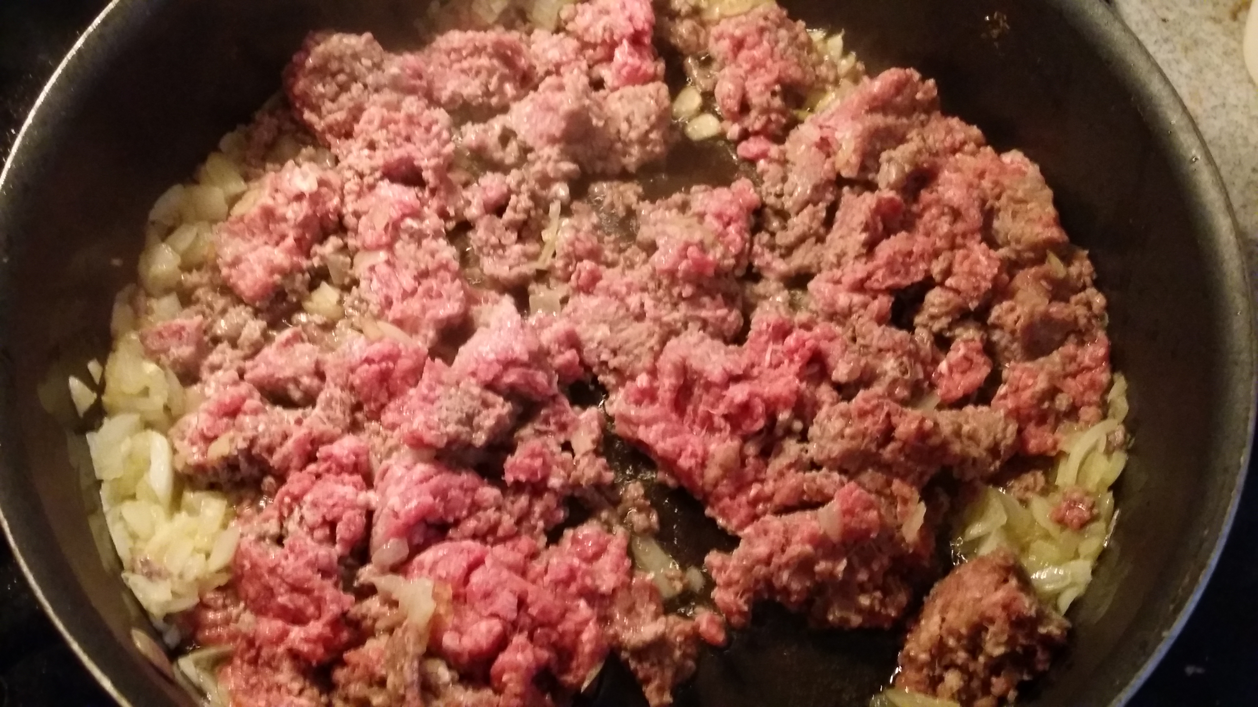 Place the ground meat on the pan with onions. Break the meat into small pieces with a spatula, add salt and pepper.