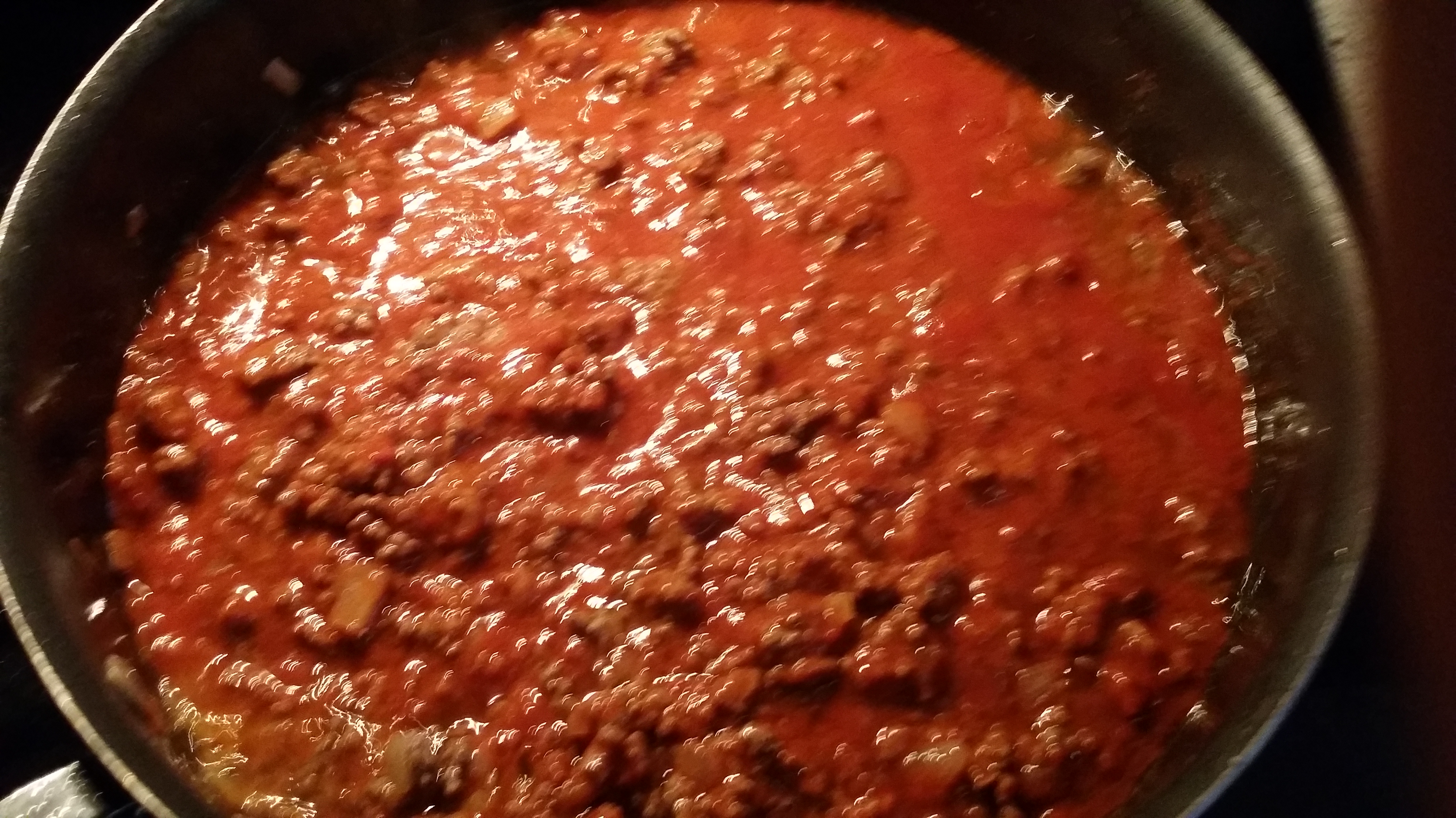 Pour the tomato sauce into the pan. Mix the sauce, meat and onions, wait for the mixture to boil. Then turn the heat down to low, cover the pan and let the sauce to simmer on low for about 15 minutes.