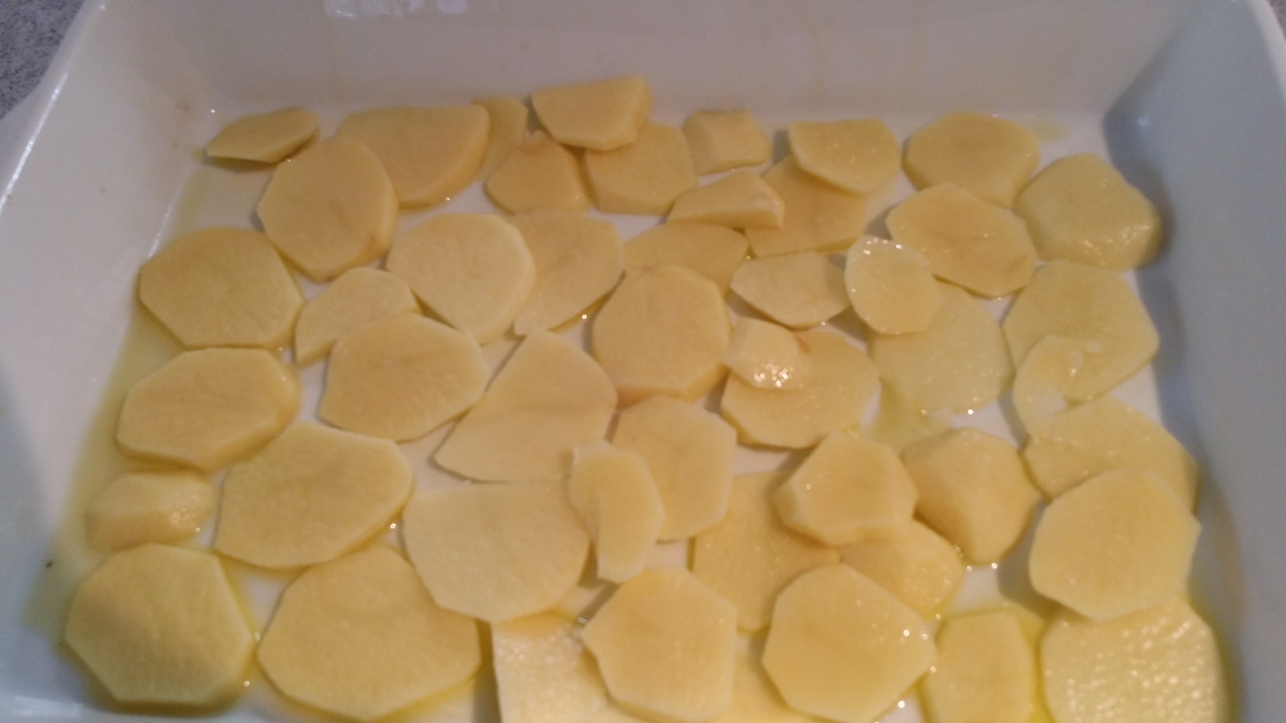 Preheat the over to 375F degrees. Peel the potatoes and slice them thinly. Cover the bottom of an oiled casserole dish with the potatoes.