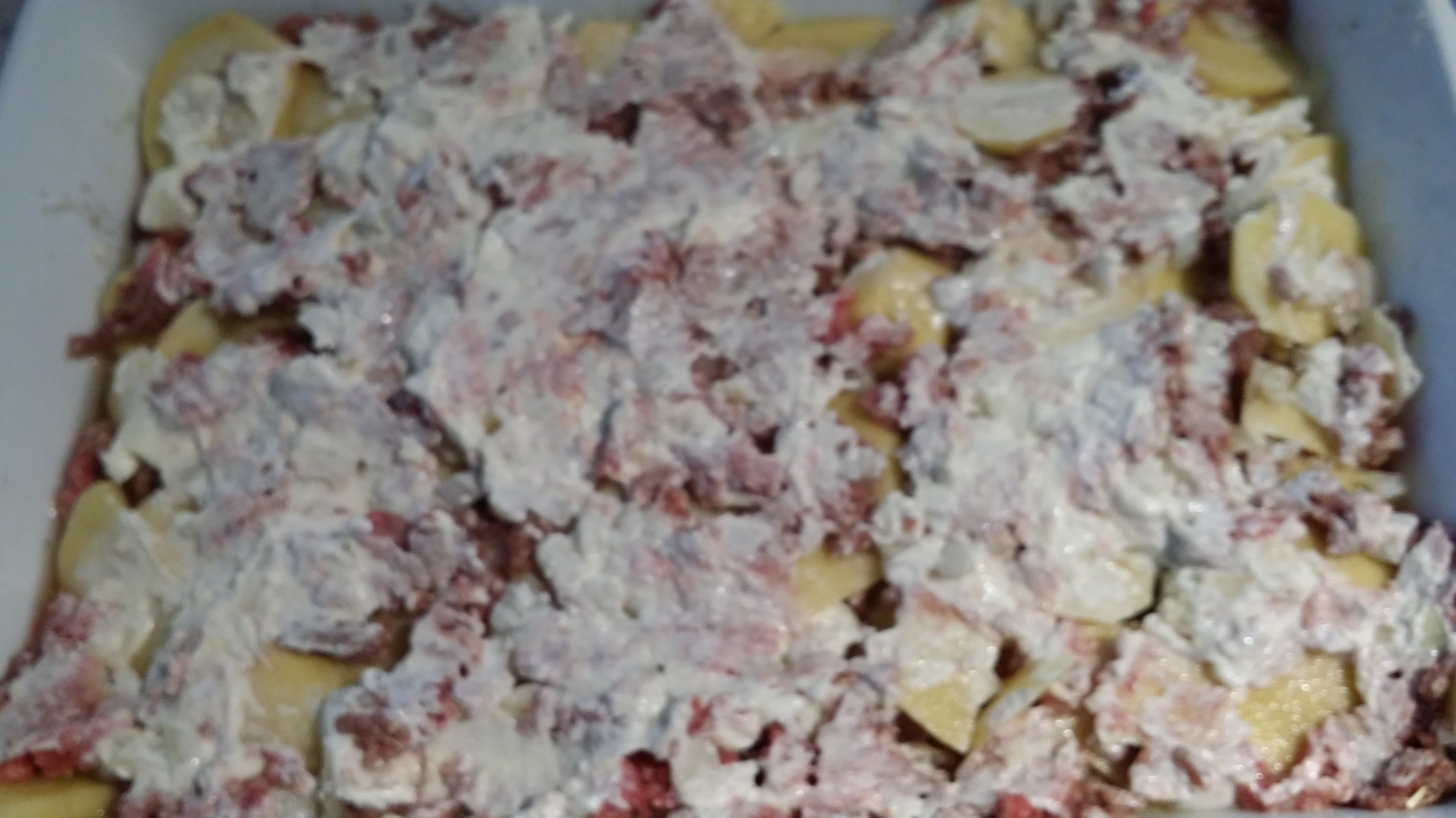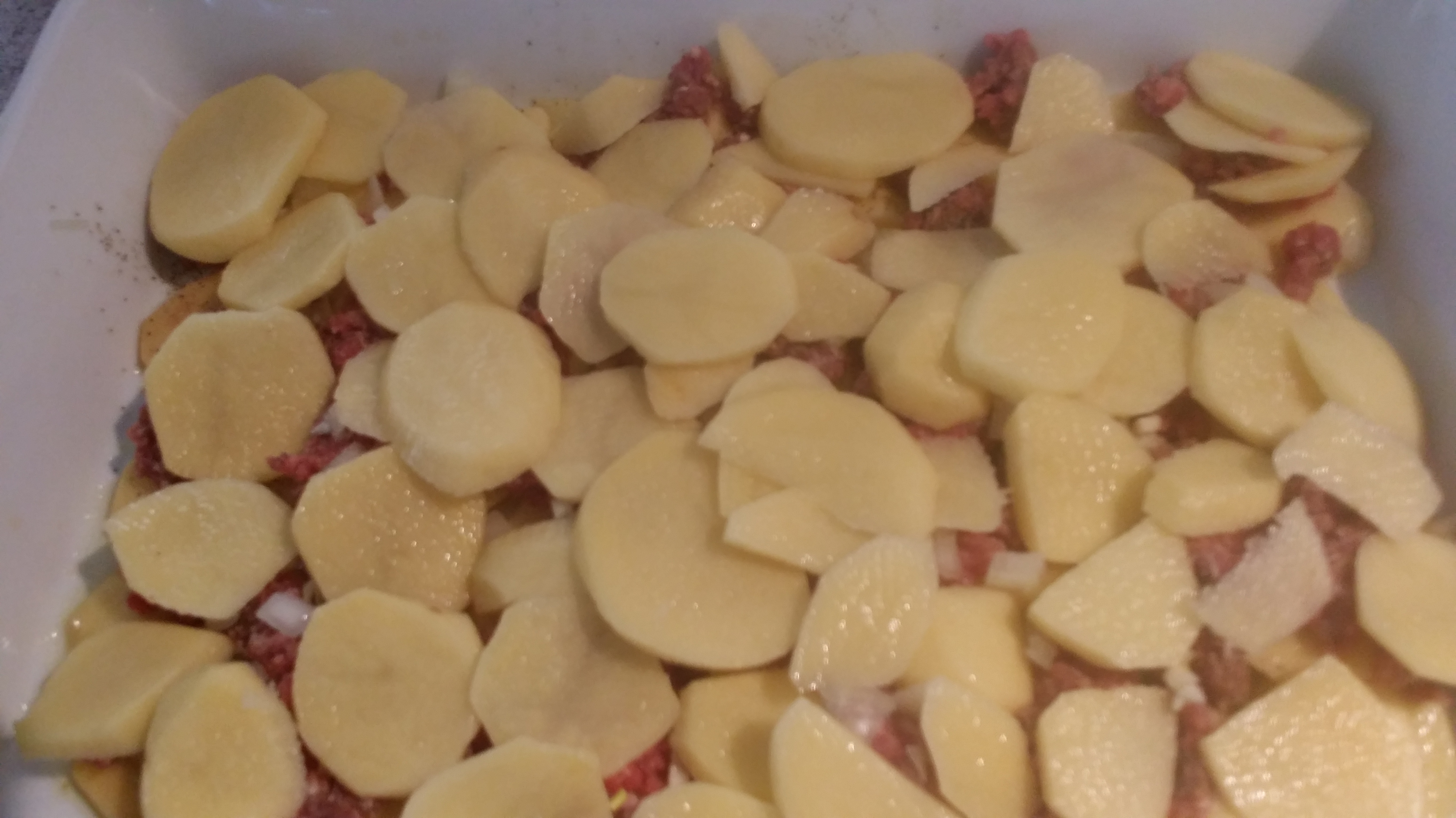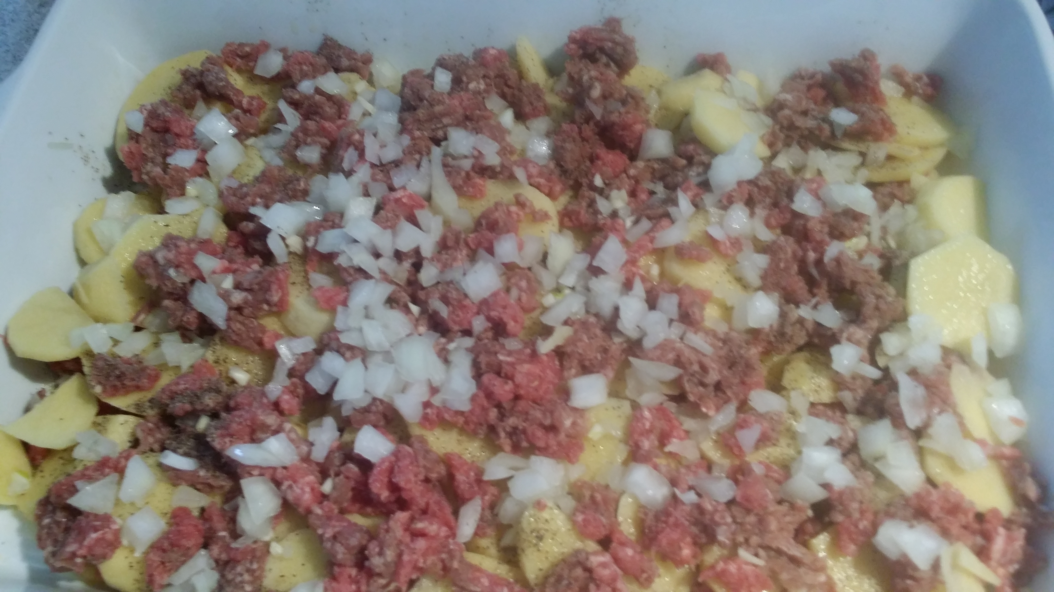 In the same order as before, spread the rest of the meat, onions, garlic, salt and pepper and on top of the potatoes.