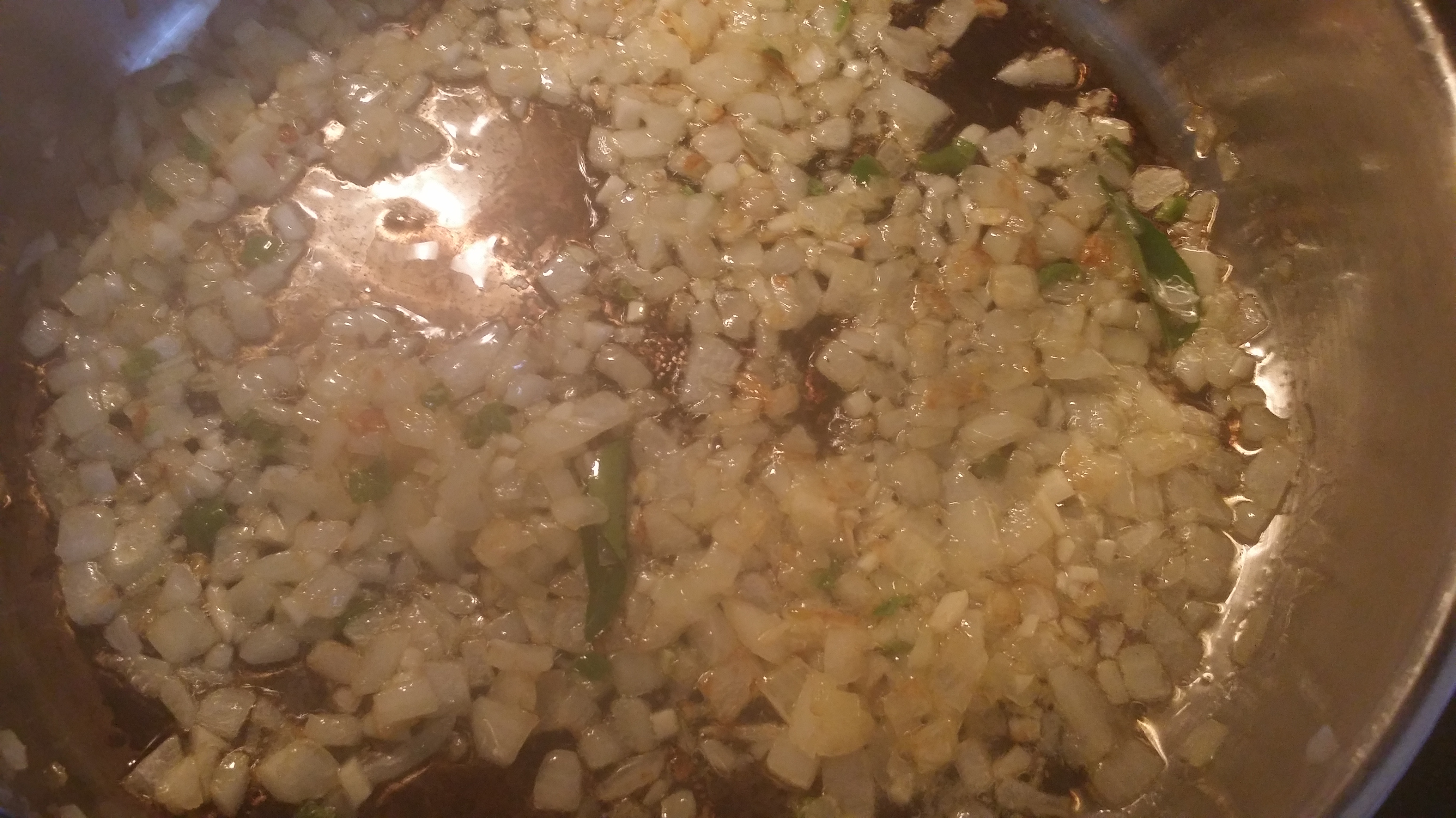 In a large saucepan sauté onions, garlic, curry leaves, and green chillies for about 1 minute. Then add fenugreek seeds, bring the heat down to low and let it simmer for another couple of minutes.