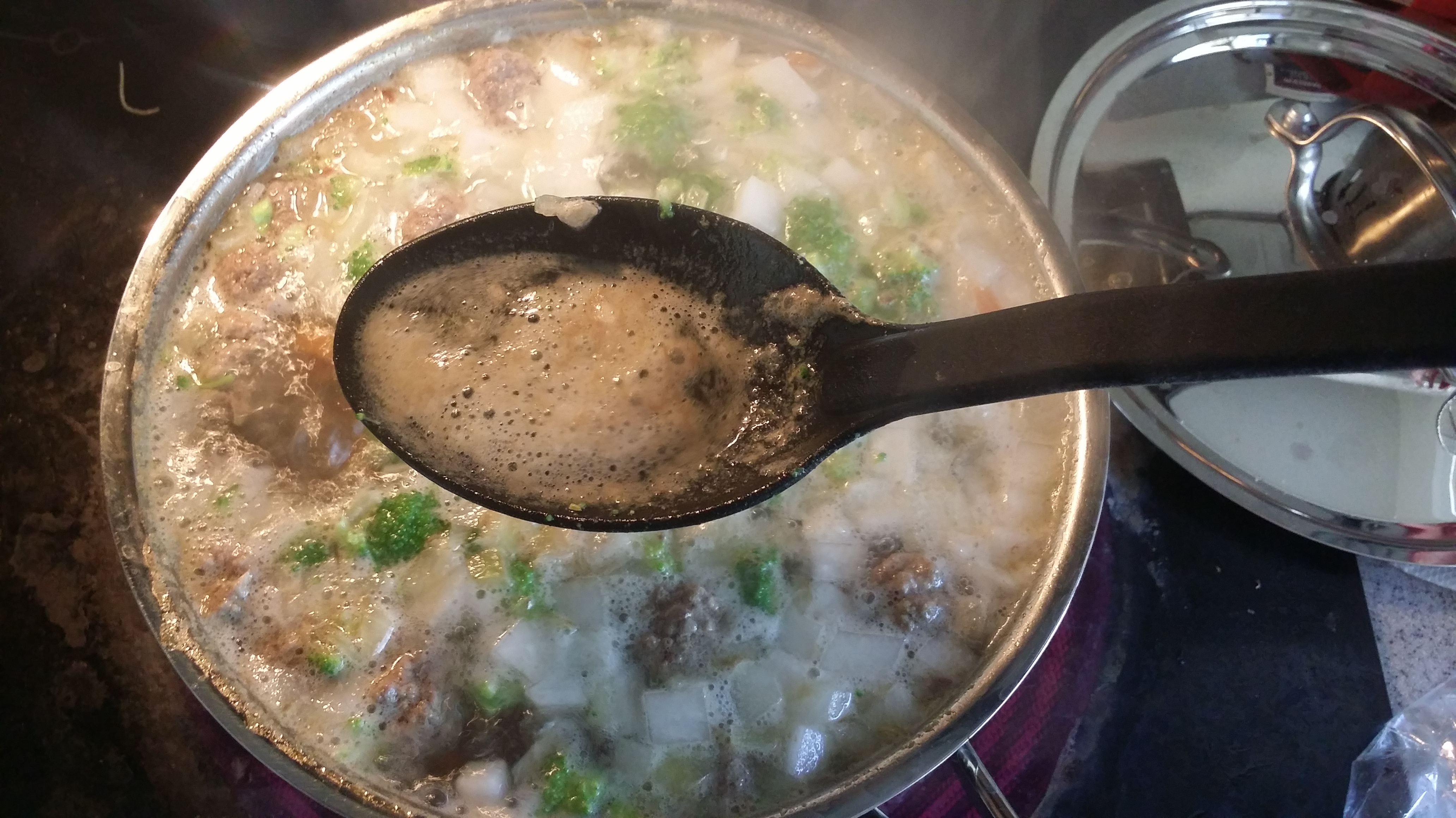 You have to take the foam off using a large spoon or you won’t have a clear broth.