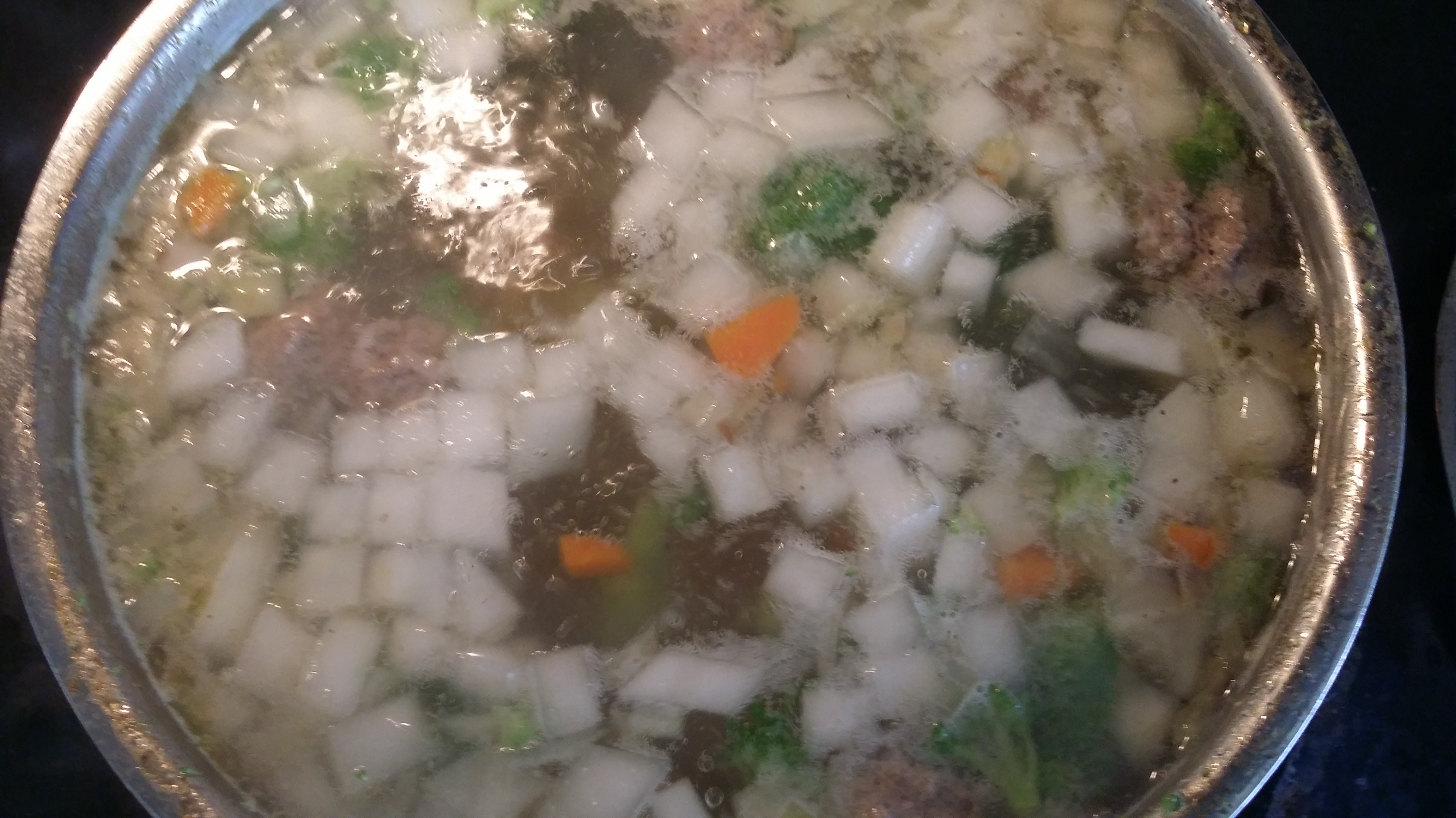 (If you are using frozen vegetables, place about one pound of frozen cut vegetables in the pot with meatballs and sauted onions and let the soup boil, take off the foam, then put your seasoning, rice and garlic and let it cook for 40 minutes).