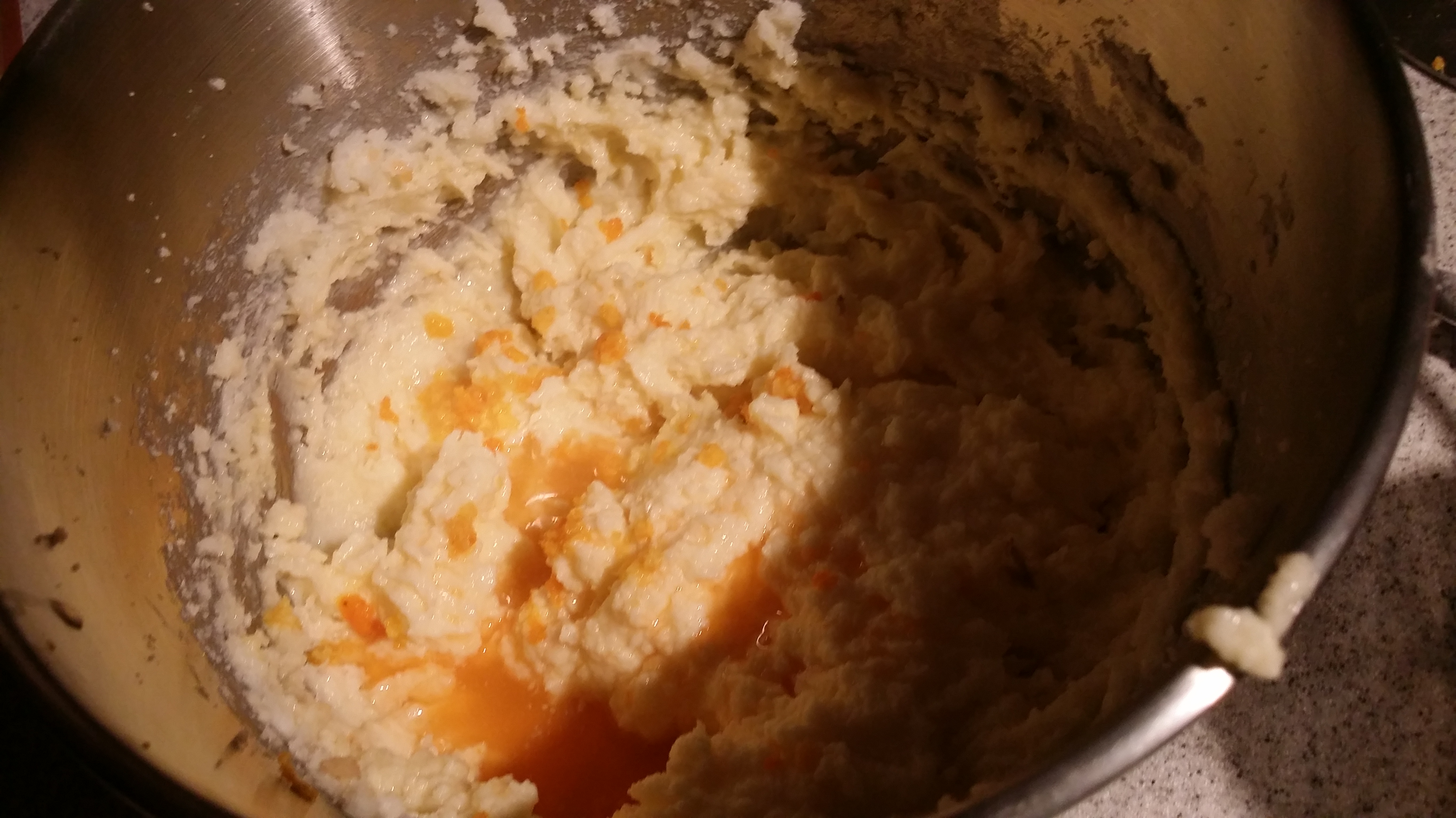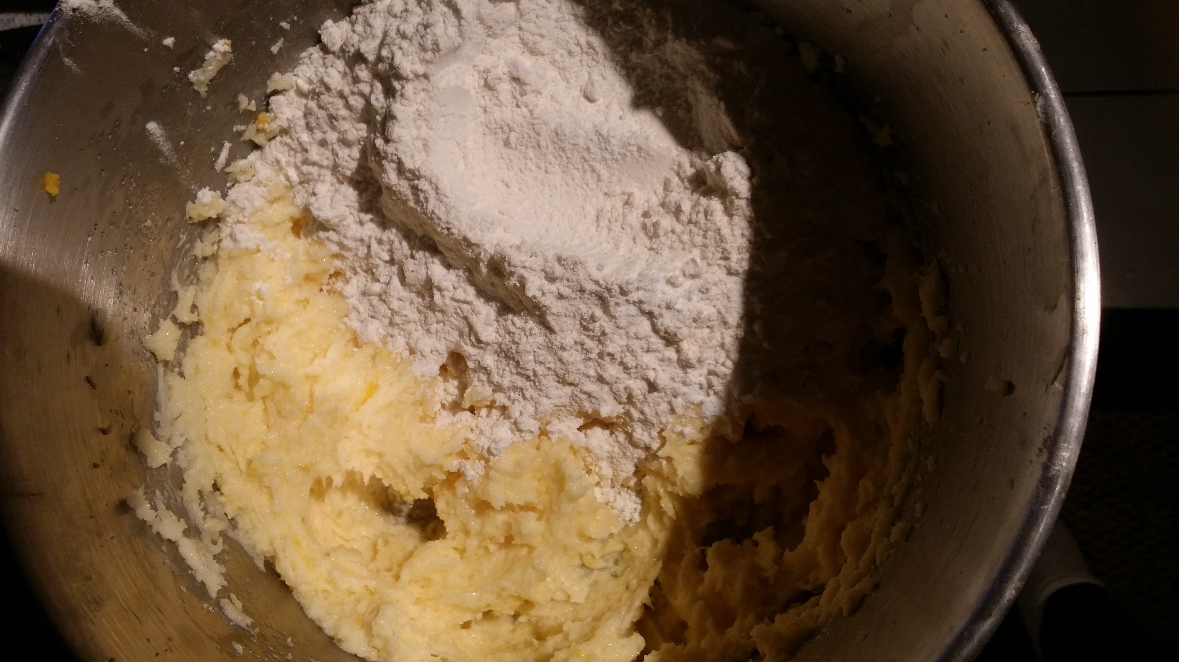 Preheat the oven to 350F degree. Beat the butter and sugar together, then add ginger, lemon zest, lemon juice and eggs. Mix it all together with an electric mixer.