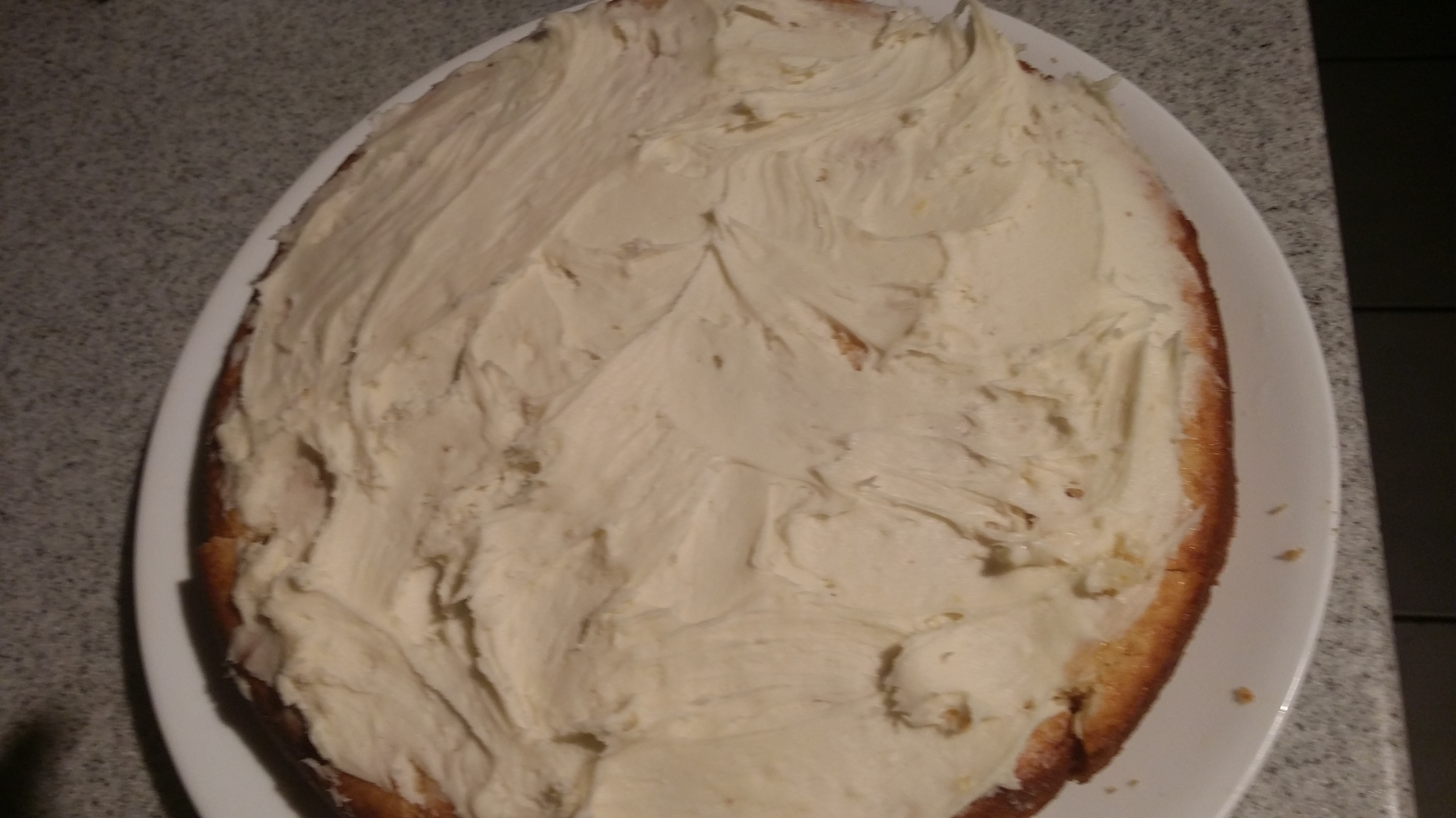 Spread the frosting on top of one cake and stack the other cake on top. Spread the frosting all around THE cake.