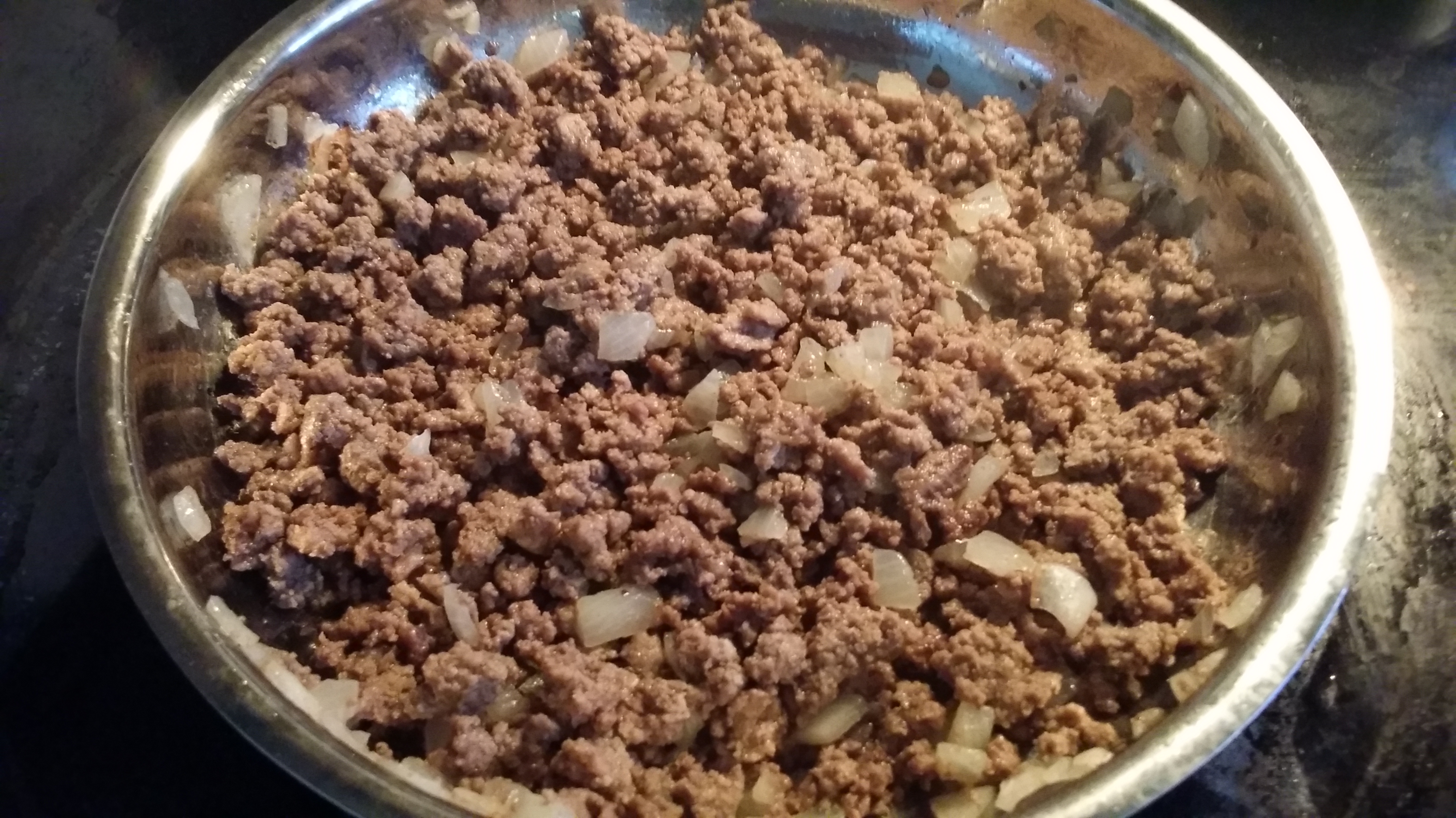 In an oiled pan saute chopped onions and ground beef, stirring occasionally.