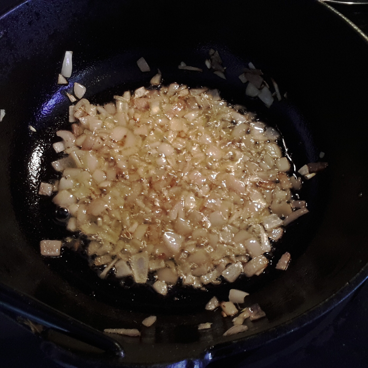 Saute the chopped onions and garlic until golden brown in a casserole dish.