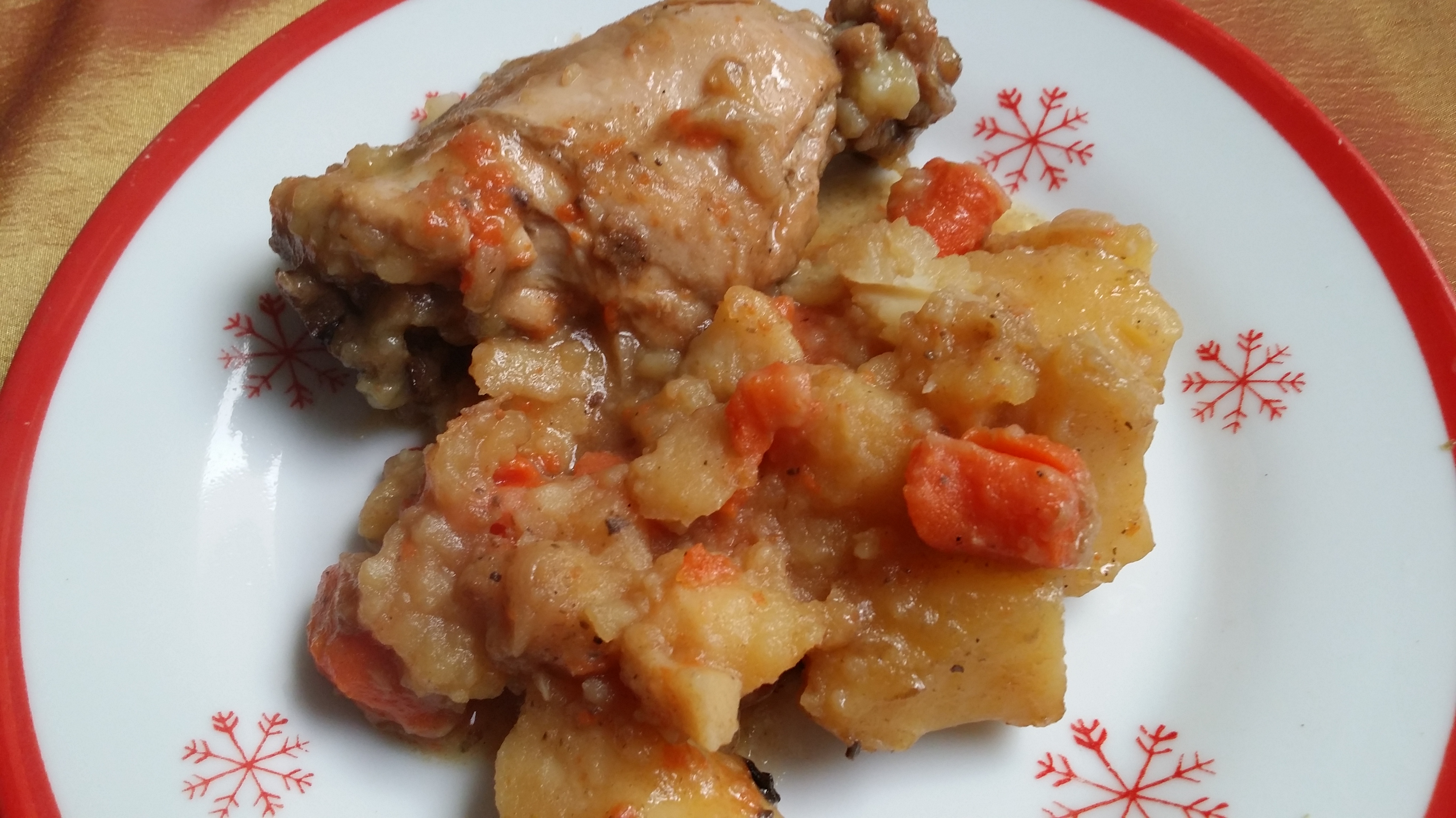 Meanwhile chop the carrots and potatoes and add them to the casserole.