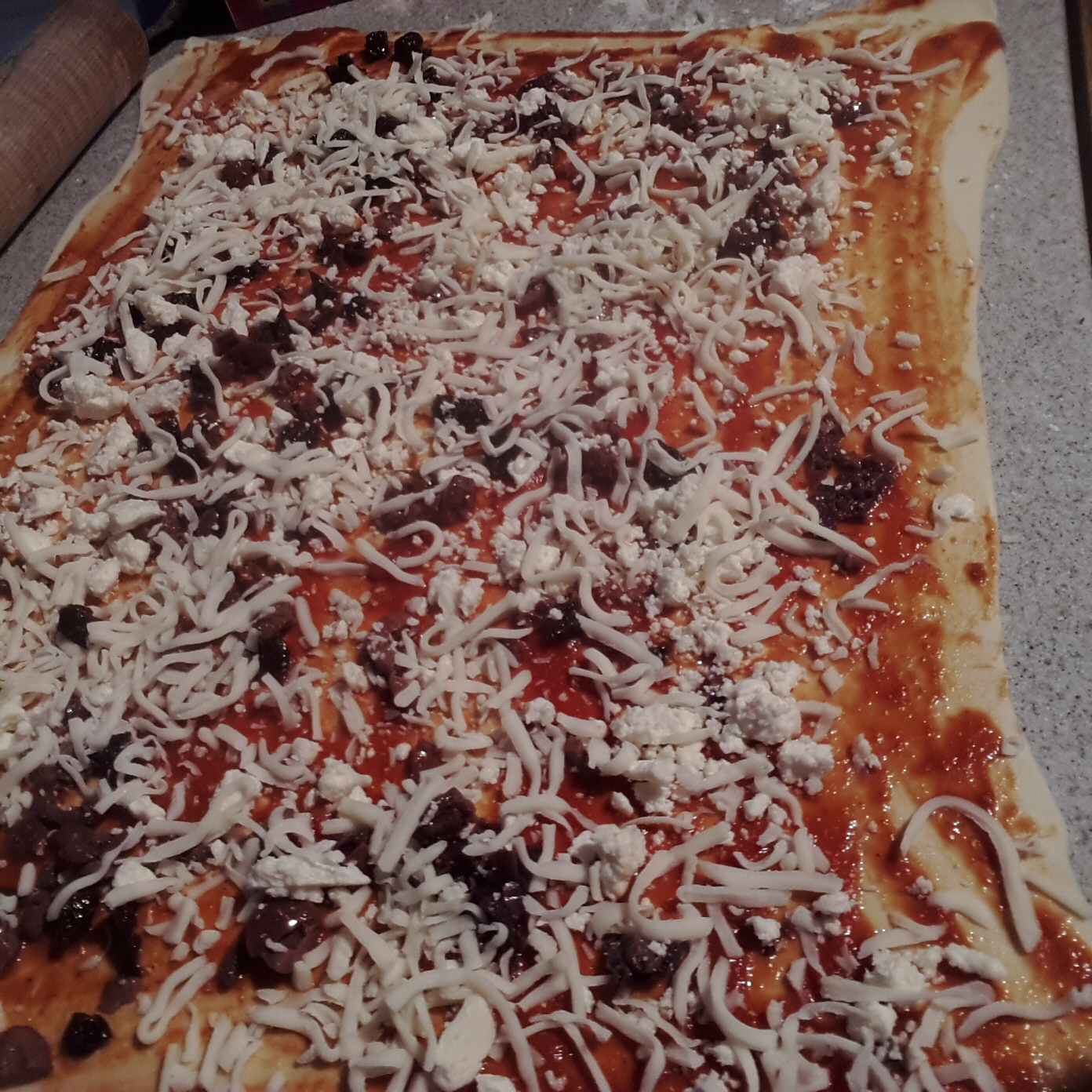 Roll the dough into a square. Spread the tomato sauce on it. Sprinkle olives, cheeses and basil on top.