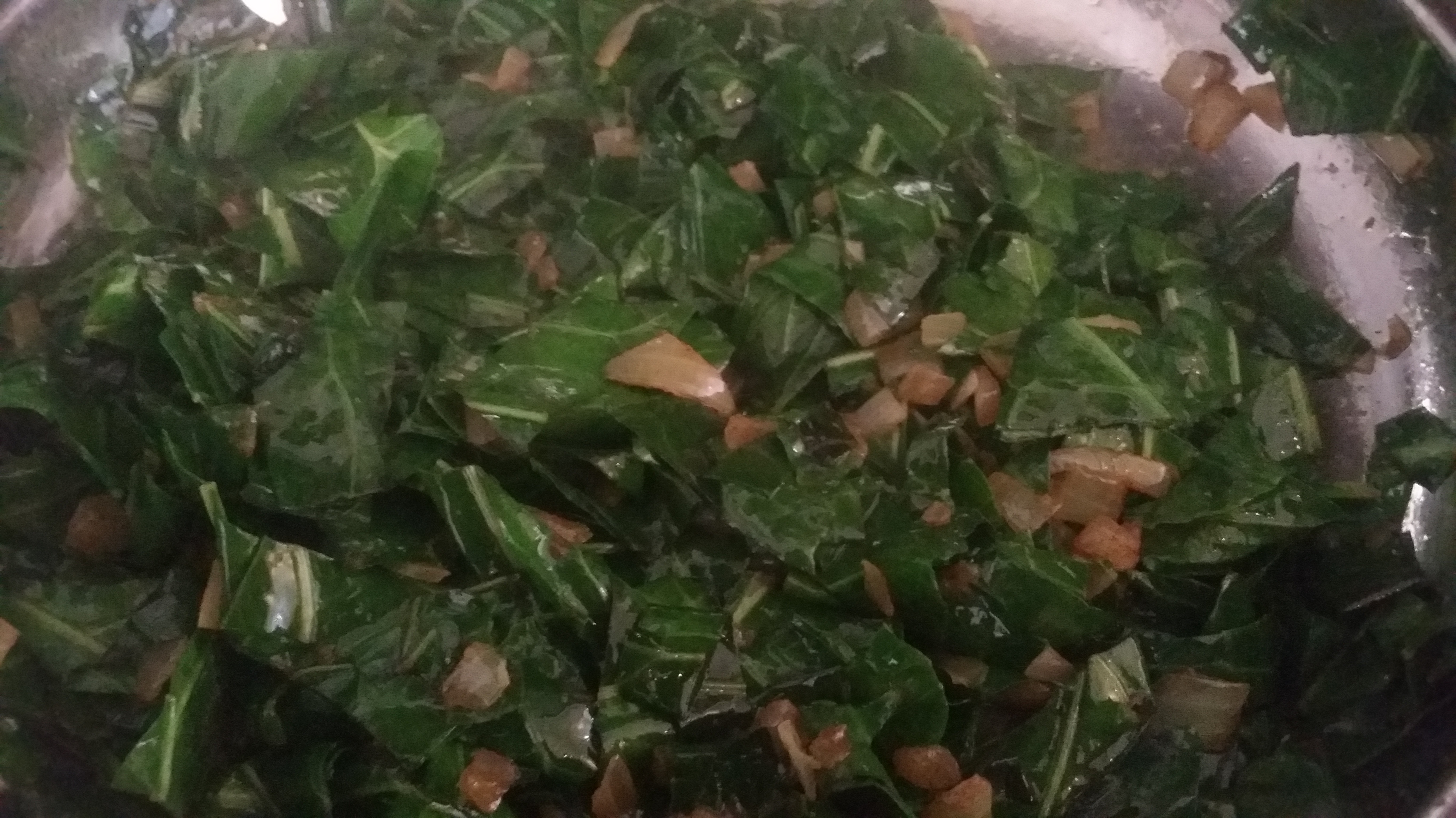 Saute chopped onions with olive oil and Moroccan El Hanous until onions turn golden (about 3 minutes on medium heat). Add in the chopped kale and cook for about 5 minutes.