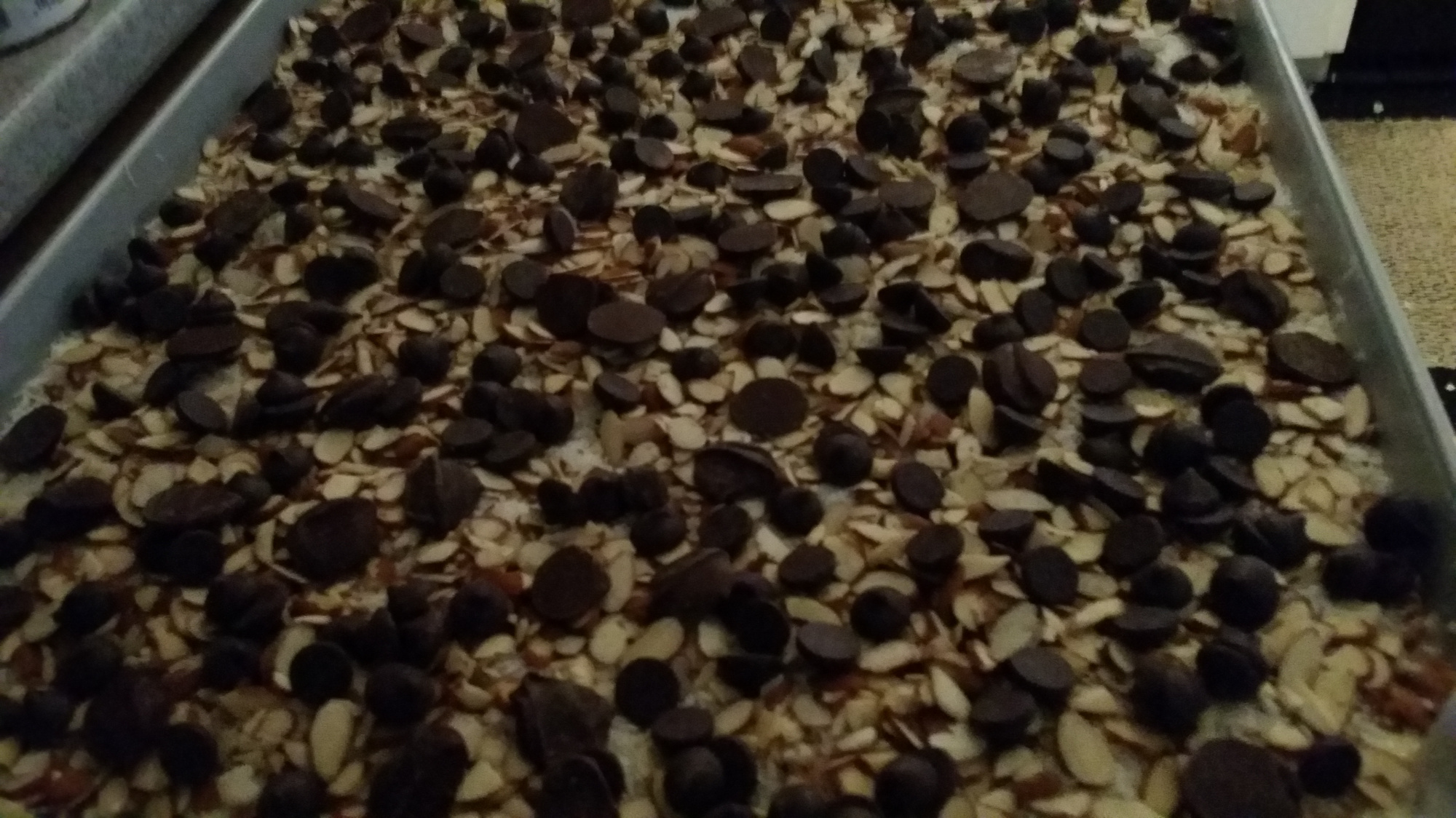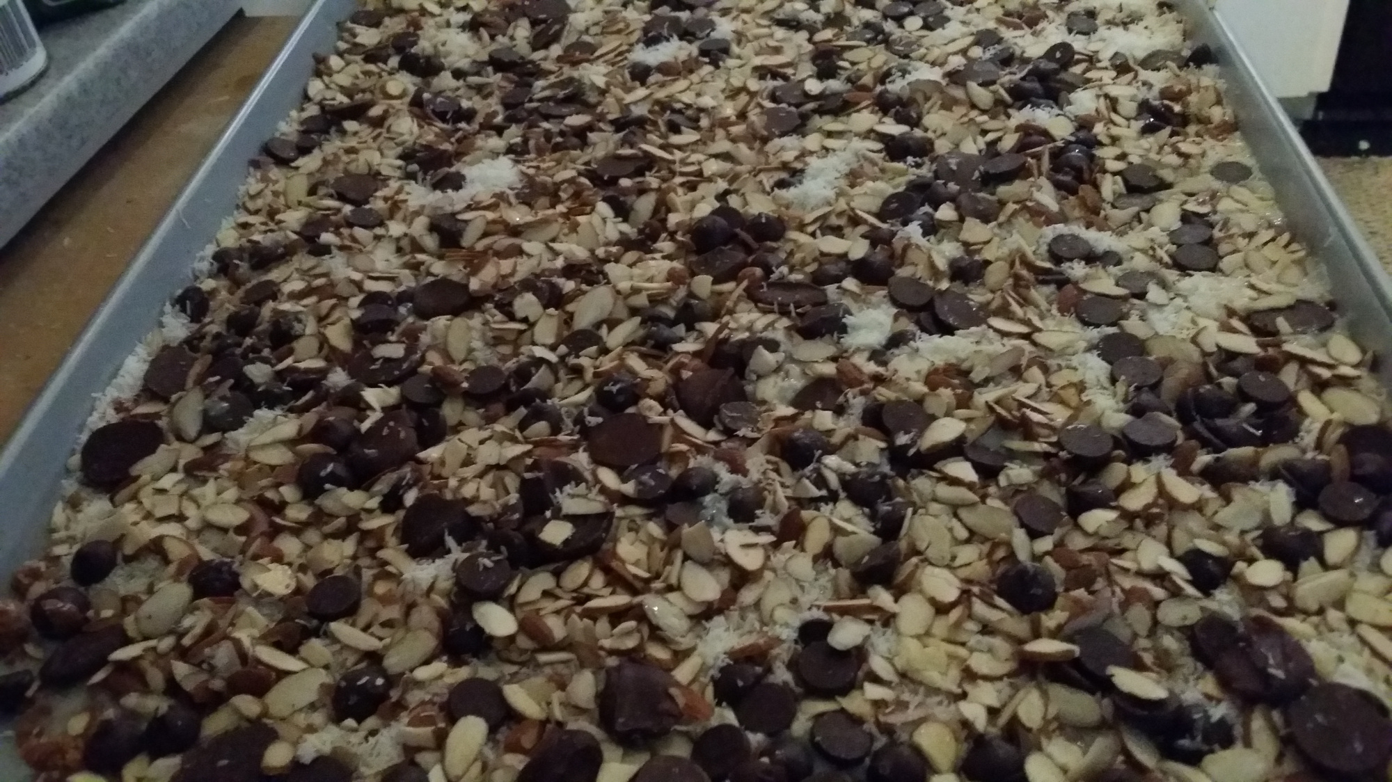 Layer evenly with chocolate chips, coconut and nuts.